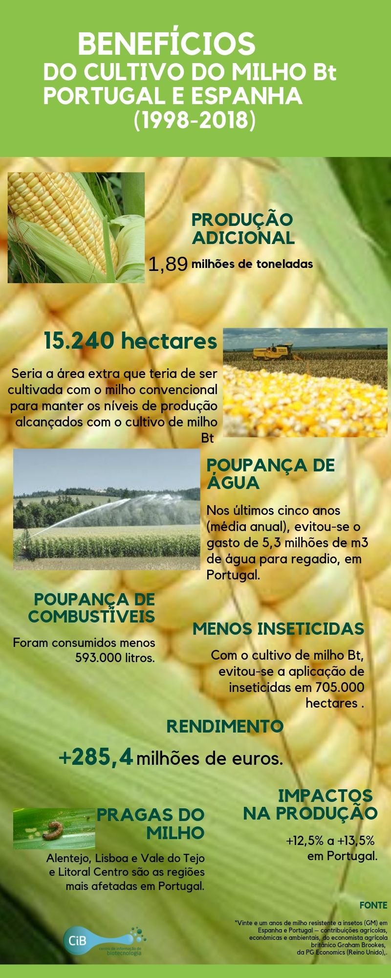 Em Portugal, em 2018, a área cultivada com milho Bt em Portugal era de 6 mil hectares, o que representa 6% da área total cultivada com milho (em Espanha, no mesmo ano, era de 115 mil hectares e em onze países fora da UE somava 85 milhões de hectares). Aceda ao estudo completo aqui.